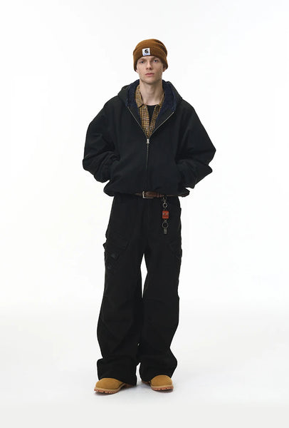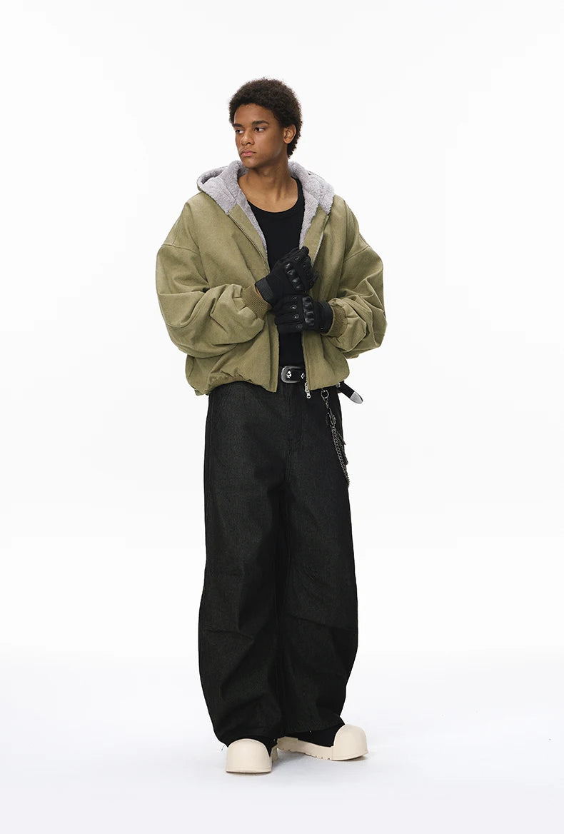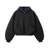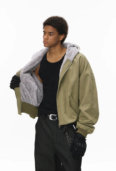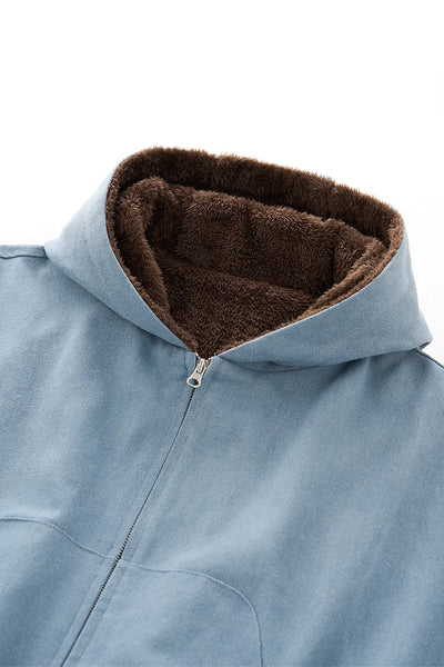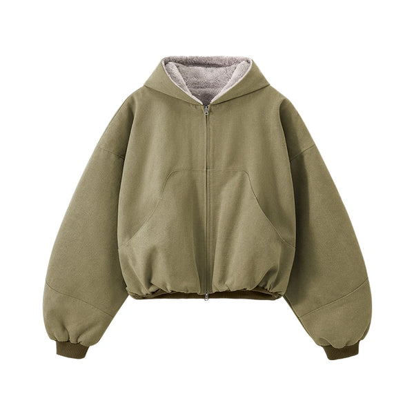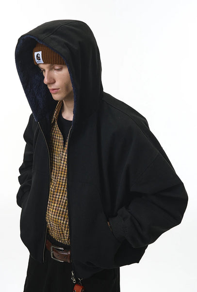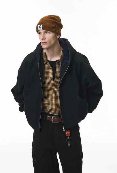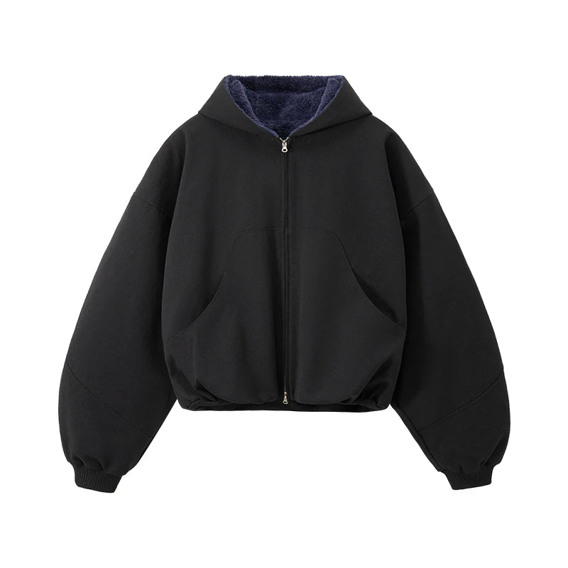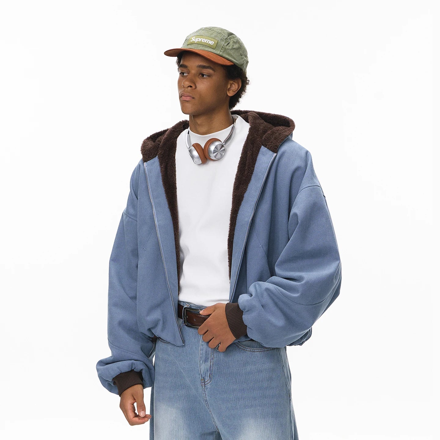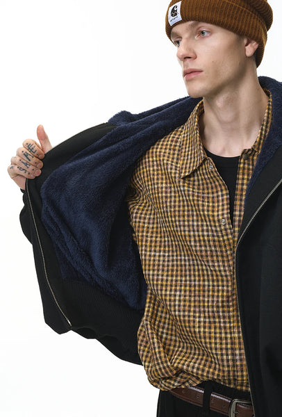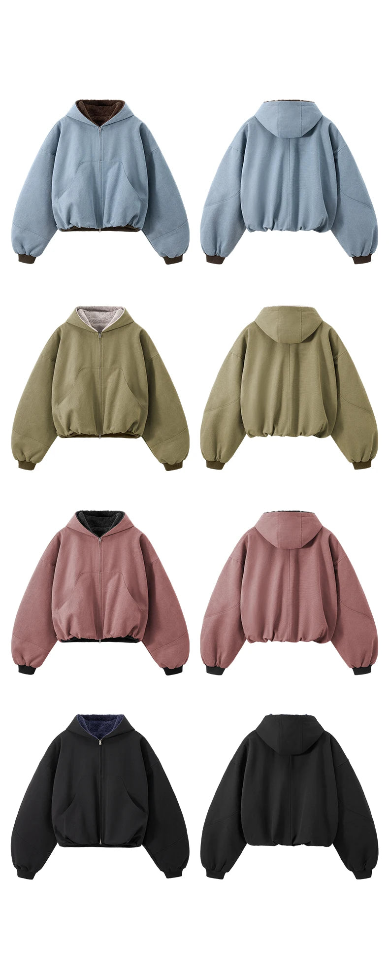 Crafted with premium cotton +polyester blend featuring hooded collar and zipper closure with contrast-colored plush lining, this fleece jacket combines practicality with styling versatility. Sturdy and structured exterior with excellent wind resistance. Workwear inspired retro texture paired with plush inner lining for warmth and windproofing. Stiff outside, soft inside , comfortable and cozy. Streamlined sleeve silhouette with curved pocket design. Spacious yet avant-garde. "Stiff exterior + soft interior" fabric keeps you warm without bulk. Stay stylish through extreme temperature swings. Perfect for travel, commuting, or shopping all scenario coverage. Features curved pocket design, tapered hem with elastic drawstring, and contrasting plush lining. Wide-sleeved design adds contemporary edge. Perfect for autumn and winter casual streetwear with knit construction.