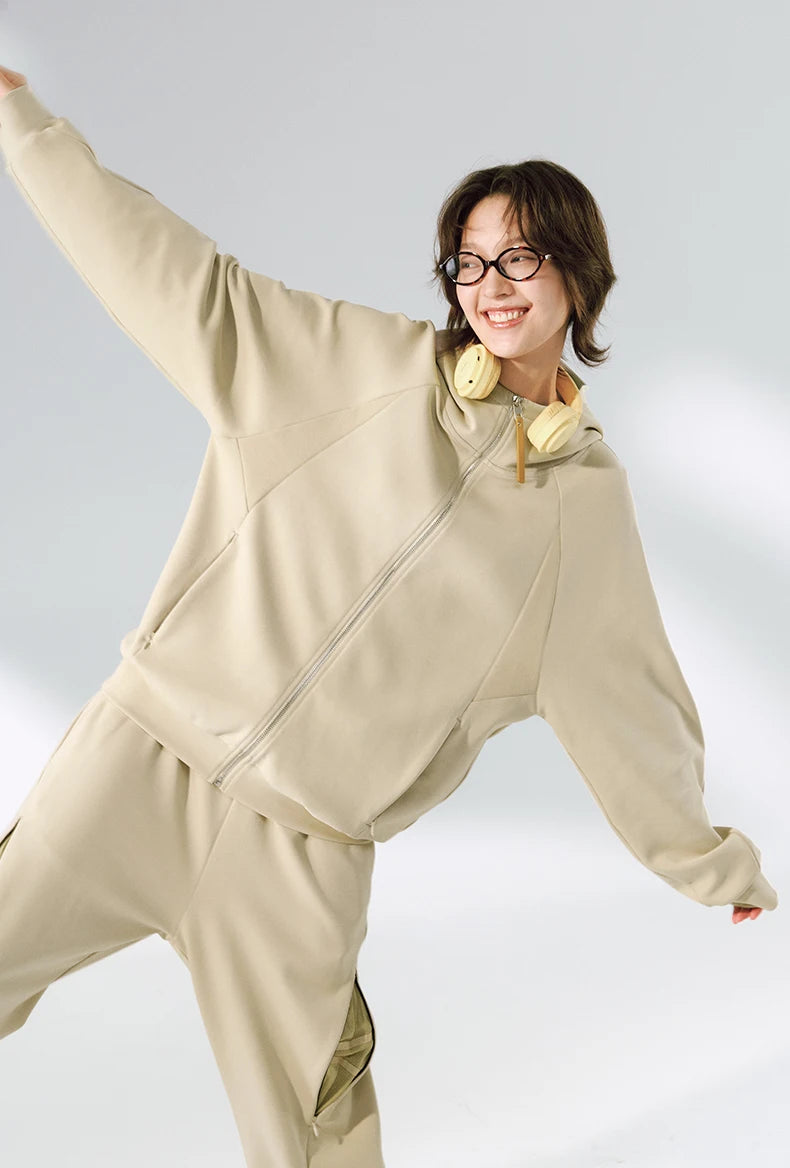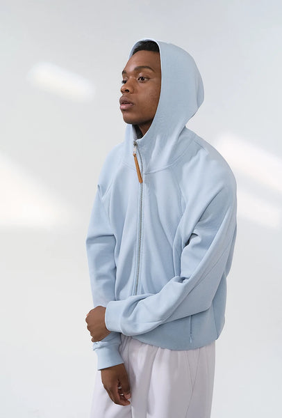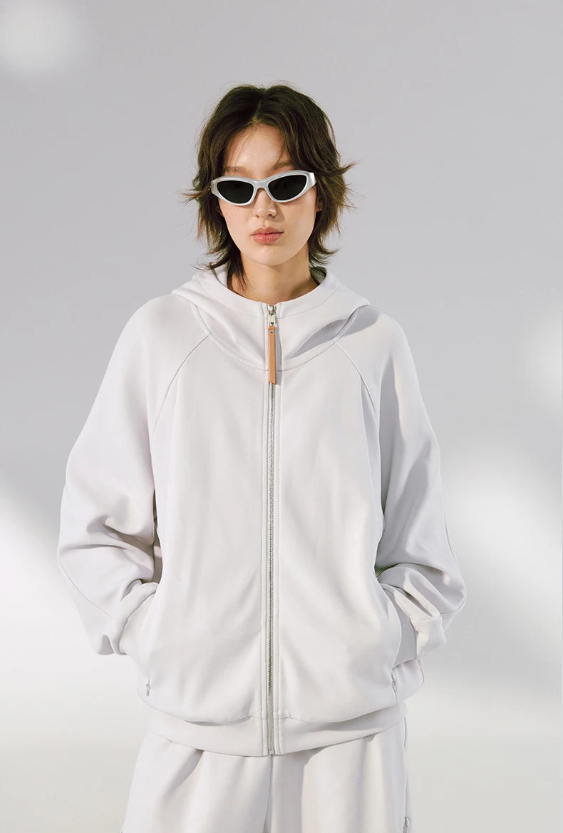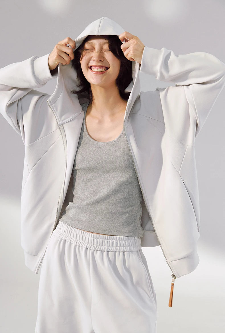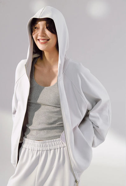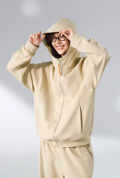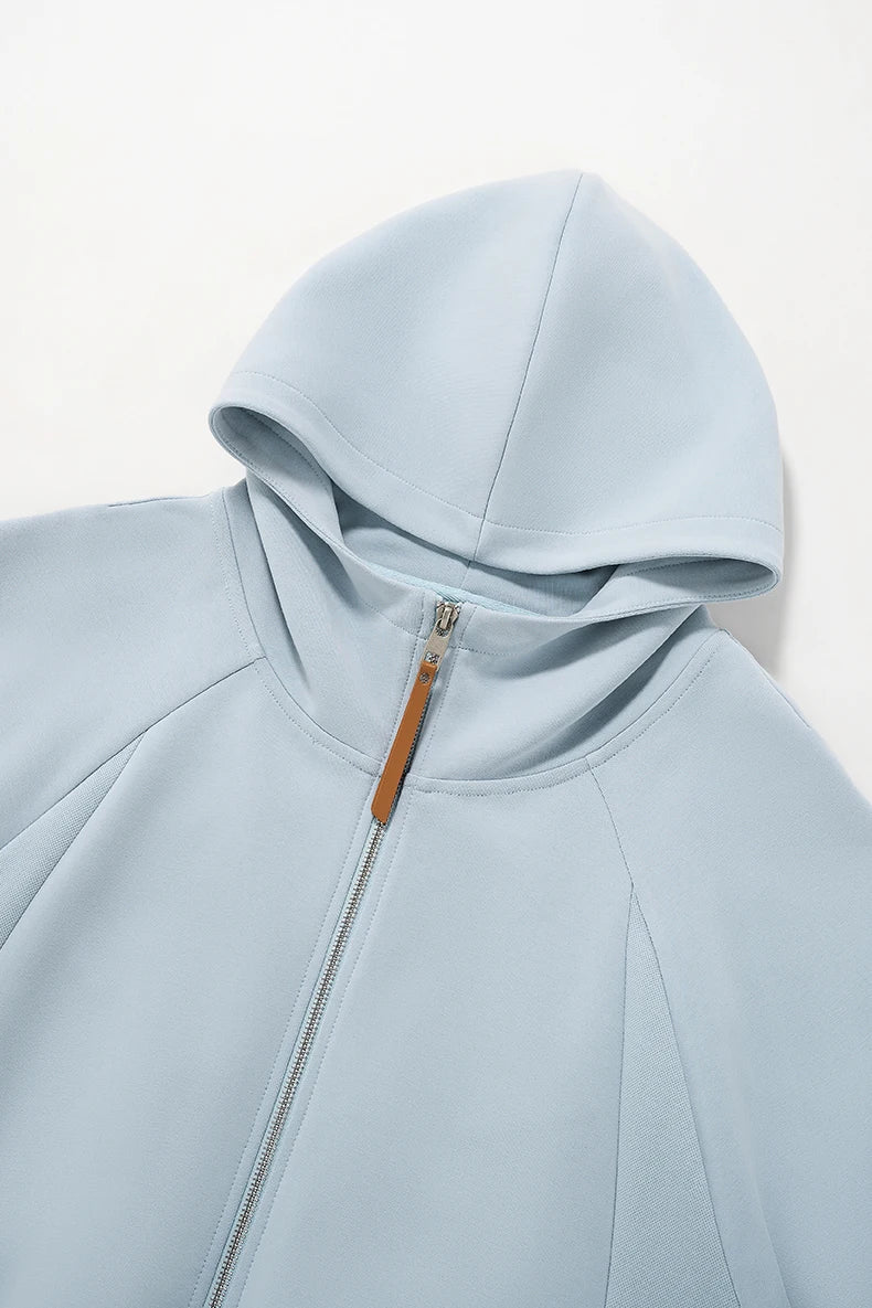 Hidden pocket design provides functional convenience. Stand-up collar with hood design adds versatile styling. Comfortable and skin-friendly fabric. High elasticity for unrestricted movement.